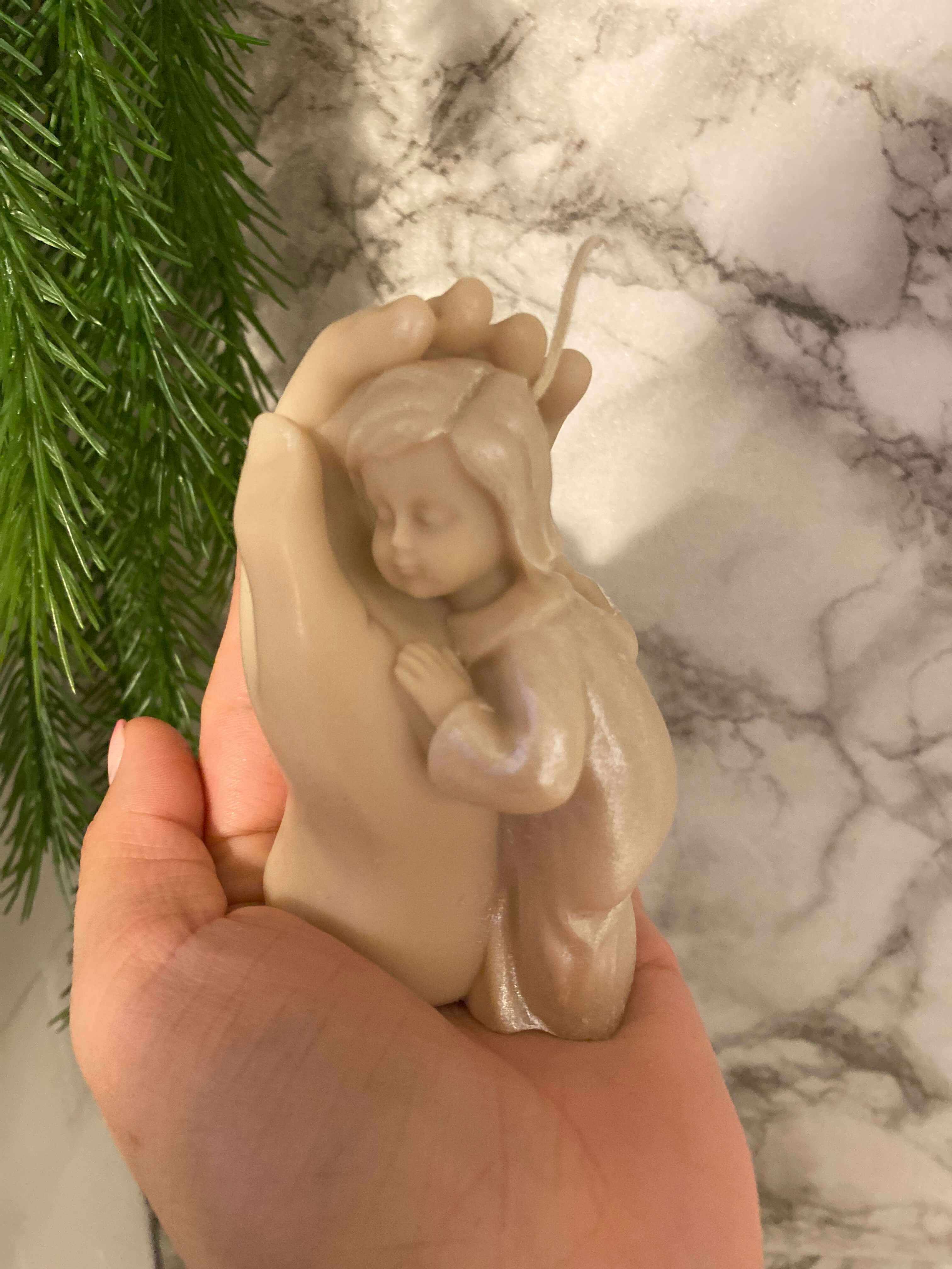 Ręcznie wykonana świeca sojowa o wyjątkowym kształcie – symboliczna figura dziecka ułożonego w dłoni to piękne wyrażenie miłości, troski i delikatności. Idealna na chrzest, narodziny, baby shower czy jako subtelny gest wdzięczności dla rodziców chrzestnych lub bliskich.